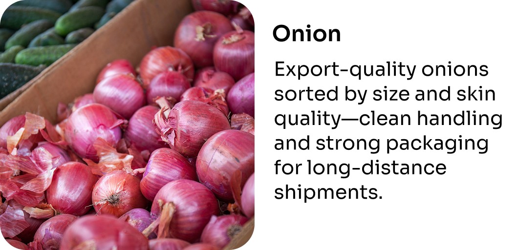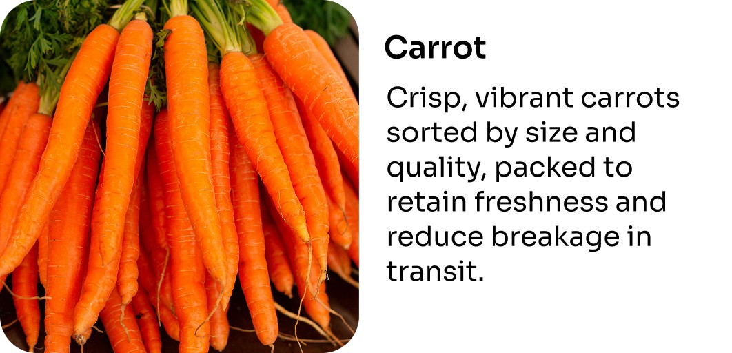 We supply farm-fresh vegetables prepared for export with a focus on consistent grade, careful handling, and packaging that protects produce during transit.